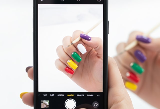 - Попробуйте разные ракурсы. Экспериментируйте с ракурсами, чтобы найти самый выгодный угол съемки. Снимайте ногти сверху, сбоку или под углом. Играя с перспективой, вы выделите особенности нейл-арта и текстуры.