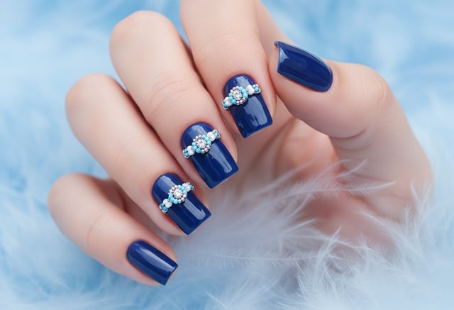 Сияющий маникюр с применением страз — еще одна замечательная идея зимнего маникюра. Разноцветные стразы или жемчужины могут быть использованы для создания различных дизайнов — от изысканных узоров до акцентов на отдельных ногтях.